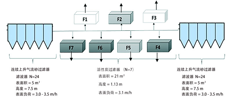 圖1:連續上流砂濾器和活性炭平行下游過濾器的示意圖。深灰色框(F4,F6和F7)是經過改造的活性炭過濾系統,淺灰色框(Rf2和Rf5)是未改造參考活性炭。存在附加過濾器(F1和F3)。