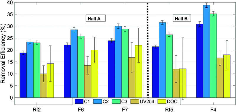 圖2:改造后的(F6,F7和F4)和參考(Rf2和Rf5)過濾器中活性炭對有機物級分的去除效率。誤差棒表示通過誤差傳播計算的標準誤差(N=4)。