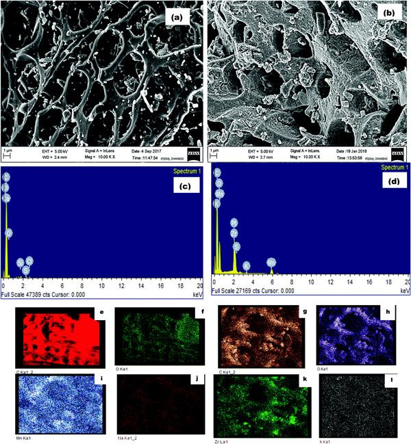 圖2:(a)活性炭和(b)載鋯活性炭的微觀形態,(c)原始和(d)ZrAC的EDX光譜以及活性炭(e和f)和載鋯活性炭(g–l)的元素圖。