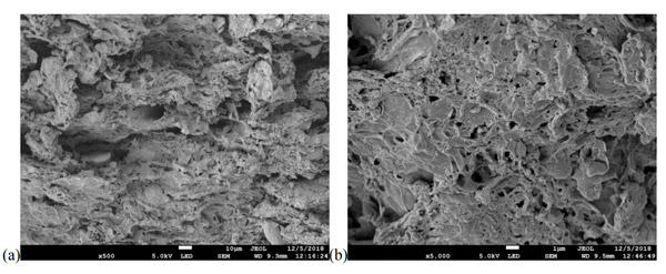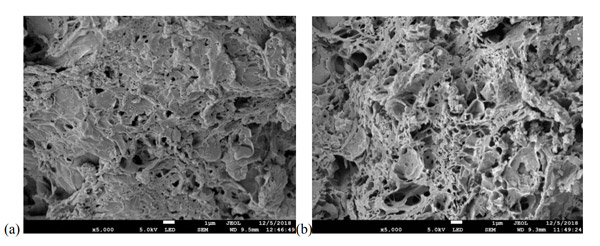 根據觀察到的活性炭微觀結構來進行形態研究。圖1顯示了在650°C(a)和850°C(b)兩種不同溫度下用25%H3PO4制成的活性炭的比較。可以看出,與650℃相比,在850℃下制備的活性炭具有稍大的孔。可以得知孔體積隨著活化溫度的升高而逐漸增加。