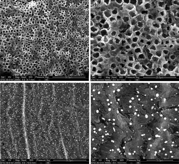 圖1:(a)活性炭的外表面SEM放大2000倍,(b)放大5000倍,(c)活性炭的內切面SEM放大2000倍,(d)放大8000倍。