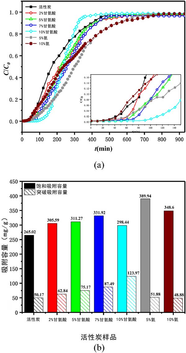 測試了選定的甲苯VOC對活性炭的吸附性能。在每個實驗運行中,甲苯通過裝有活性炭的吸附管直到達到平衡,即活性炭吸附劑被甲苯飽和。圖2(a)所示的穿透曲線呈現為甲苯吸附量吸附(ç/ç0)與接觸時間(噸,分鐘)六種的活性炭正在進行中,它們的飽和和突破吸附容量如圖2所示(b)。從吸附曲線可以看出,甘氨酸修飾的活性炭的穿透時間明顯延長,而飽和氨改性活性炭的時間延長。活性炭上甲苯穿透吸附能力的順序為10%甘氨酸改性活性炭>7%>5%>2%>5%氨改性活性炭>未改性活性炭>10%氨改性活性炭,而活性炭對甲苯飽和吸附容量的順序如下:5%氨改性>10%>7%甘氨酸改性>5%>2%>10%>未改性活性炭。可見甘氨酸修飾對甲苯吸附有顯著的正向影響。與原來的AC相比,甘氨酸改性的活性炭對甲苯的突破吸附能力分別提高了25%、50%、74%和147%,隨著甘氨酸濃度的增加呈上升趨勢。同時,甘氨酸改性的活性炭對甲苯的飽和吸附容量分別增加了15%、17%、25%和13%,且隨著甘氨酸濃度的增加先增加后減少。5%和10%的氨改性也提高了甲苯的吸附性能,但其優勢主要體現在飽和吸附容量上,與原來的活性炭相比,分別提高了47%和32%。