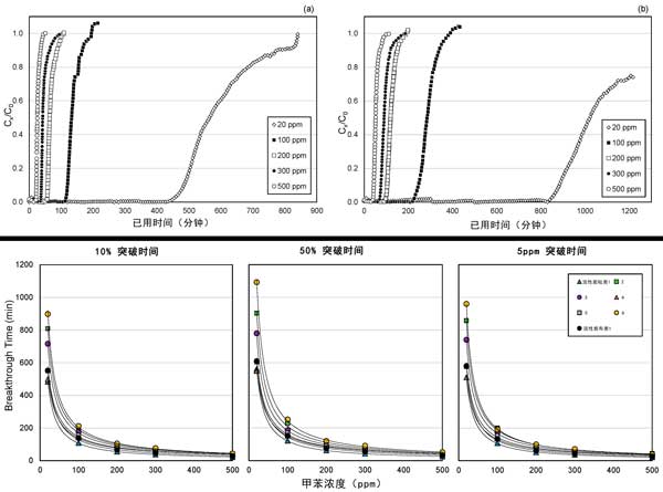 圖2:(a)活性炭濾芯1和(b)6小柱類型的突破曲線(按甲苯濃度),穿透時間與不同小柱類型的甲苯濃度的函數關系。