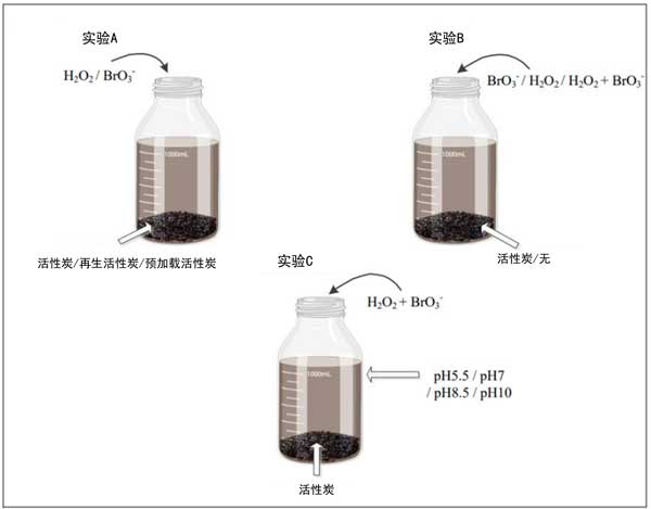 在對(duì)50家飲用水公用設(shè)施進(jìn)行的調(diào)查中,獲得過氧化氫和溴化物的平均值來當(dāng)做測(cè)試用水。在所有實(shí)驗(yàn)中,批量反應(yīng)器都用薄箔包裹。制備0.052µmol/L溴酸鈉溶液并加入間歇反應(yīng)器中以獲得0.5µmol/L溴酸鹽的濃度。高級(jí)氧化工藝中的出水殘留過氧化氫濃度不會(huì)超過180µmol/L。因此,在本研究中,將150µmol/過氧化氫加入到間歇式反應(yīng)器中。如圖1所示,在23–27℃的環(huán)境溫度下,使用36個(gè)批次玻璃瓶進(jìn)行了一系列實(shí)驗(yàn)。活性炭用量始終為5g/L,過氧化氫和溴酸鹽濃度始終分別為150µmol/L和0.5µmol/L。所有裝有過氧化氫的間歇式反應(yīng)器都用鋁箔覆蓋,以防止過氧化氫被光潛在降解。在如圖1所示的實(shí)驗(yàn)中,使用16個(gè)間歇式反應(yīng)器和三種不同的活性炭(活性炭、再生活性炭和預(yù)加載活性炭)來研究不同運(yùn)行時(shí)間的活性炭對(duì)溴酸鹽和過氧化氫的去除,該實(shí)驗(yàn)涉及八個(gè)處理組。