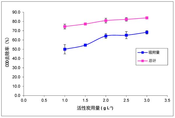 圖2顯示了在25℃、pH=7.5和170rpm的攪拌速率下,不同活性炭用量對(duì)COD去除的影響,持續(xù)24小時(shí)。我們測(cè)試了1.0、1.5、2.0、2.5和3.0g活性炭以確定合適吸附劑劑量。隨著活性炭濃度從1g增加到3g,觀察到COD去除率從50.0±5.1%和74.5±2.6%逐漸增加到吸附和總量的68.3±1.9%和83.9±1.0%。COD濃度從280.0±28.3略微下降至177.5±10.6mg。許多研究都報(bào)告說,隨著活性炭用量的增加,有機(jī)材料的去除率也會(huì)增加,這可以通過總比表面積和吸附劑上的活性位點(diǎn)來解釋。