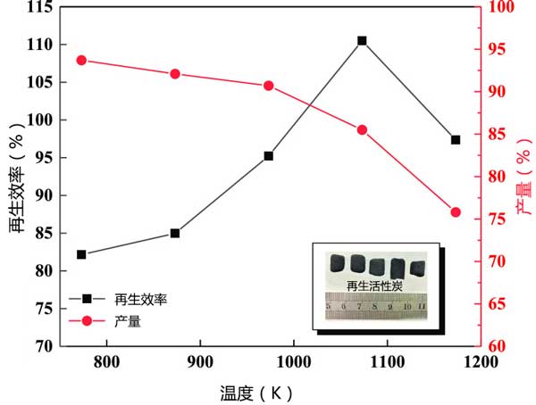廢活性炭在Na2CO3溶液和HF溶液處理后具有良好的吸附性能。然而,織構特性的恢復并不顯著,廢活性炭的微孔率占總孔隙率的百分比低于活性炭。CO2活化處理可以改善廢活性炭的質構特性,提高脫硫能力。活化溫度對廢活性炭再生效率和產率的影響列于圖4。隨著活化溫度從500℃提高到800℃,再生效率從82.15%提高到110.5%,產率逐漸下降。這是因為活性炭在高溫下與CO2反應使原始碳重新活化,進一步發展了活性炭的阻塞孔隙度并產生了新的孔隙。然而,當溫度為900℃時,再生效率嚴重下降到97.35%。這可能是由于活化反應的繼續增強會導致原有的孔結構被破壞,部分微孔塌陷為中孔。
