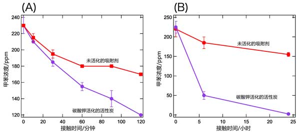 為了研究在此處使用的條件下K2CO3活化的活性炭是否可以完全去除甲苯,觀察甲苯濃度24小時。圖3b顯示了24小時觀察期間甲苯濃度與時間的關系;钚蕴匡@然能夠從空氣中吸附大量氣態甲苯。吸附24小時后的最終甲苯濃度非常低,僅檢測到痕量的甲苯。相比之下,當使用未活化的吸附劑時,即使在吸附24小時后,仍有相當數量的甲苯(160ppm)。