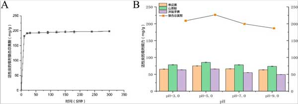 圖1:銀杏葉中銀杏總黃酮的靜態吸附曲線(A)和pH對活性炭靜態吸附的影響(B)。