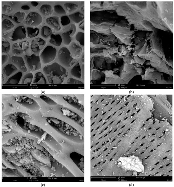 在溶劑加載之前的活性炭通過使用掃描電子顯微鏡作為SEM顯微照片進行表征(圖1)。分析表明,不僅研究不同材質活性炭彼此的不同,而且在一種材料中也可能出現不同的結構(圖1a與圖1b、圖1c與圖1d、圖1e與圖1f和圖1g與圖1h)。所有的材料都不是均質的,在所有的原材料中,都可以發現具有不同孔隙率的顆粒、壓實的塊狀,甚至是纖維結構。材料C1(粒徑0.5÷0.75mm的活性炭)是高度多孔的,顆粒充滿可見孔,直徑為5÷11µm,壁光滑(圖1a),顆粒結構的壁密度較低,但也有很大的表面積(圖1b)。粉狀活性炭(C2)具有較小的(圖1d)和較大的(圖1c)孔,具有光滑(圖1c)和較粗糙(圖1d)的壁和細長的形狀。這兩種材料似乎都具有良好的孔隙率和表面,因此它們應該是非常有效的吸附劑。我們的結果證實,C1和C2在鉭的去除方面都非常有效,去除效率約為97%。C3的多孔性要小得多。雖然有一些顆粒具有相對較高的孔隙(圖1e),但也有較高含量的更致密、相當無孔的塊狀(圖1f)。孔隙結構受到輕微干擾,可能是由植物材料中可能存在的無機化合物晶體造成的(圖1e)。因此,這種結構表明較低的表面和吸附特性。然而,無孔件的表面積似乎很發達(圖1f)。這是相當虛幻的,因為在使用的所有活性炭中,材料C3的鉭去除效率最低(81%)。最小的大孔材料似乎是C4炭。它由具有緊湊結構的塊(圖1g)和類似于納米管或纖維結構的形式(圖1h)組成。這種材料的多孔性也比C1和C2少,但由于纖維的原因,它的表面應該比C3更發達,因此它應該具有更好的吸附效率。事實上,這種材料的鉭去除效率略高于C3,但仍低于活性炭C1和C2。根據這些結果,可以得出結論,C1和C2的原材料就具有大孔結構。