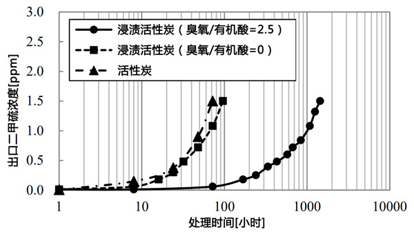 當吸附劑為活性炭和2.5臭氧/有機酸的浸漬活性炭時,進行了動態吸附實驗。圖3顯示了動態吸附實驗中出口二甲硫濃度的時間變化,浸漬活性炭在2.5臭氧/有機酸下的吸附能力是活性炭的15倍。這些結果表明浸漬的活性炭可以作為臭氧氧化的催化劑。吸附速率常數不會因改變臭氧/有機酸而改變。這些結果表明,有機酸氧化不影響吸附速率。通過比較浸漬活性炭在臭氧和有機酸下的結果,可以看出浸漬活性炭的吸附能力高于活性炭。這是由于二甲硫被碘酸氧化。浸漬活性炭的吸附速率常數與活性炭的吸附速率常數幾乎相同。該結果表明浸漬不受流體膜或細孔擴散速率的影響。