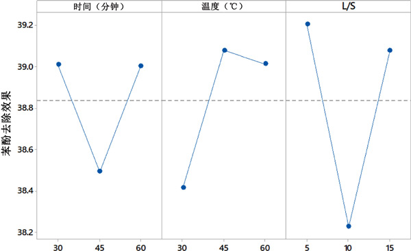 田口法用于優(yōu)化參數(shù),即時間、溫度和L/S,這些參數(shù)直接取決于苯酚的去除。選擇田口方法的選項越大越好。本研究的主要目的是活性炭從廢水中去除較多的苯酚,因此選擇了越大越好的選項。此外,采用添加劑模型來確定各個輸入?yún)?shù)對去除苯酚濃度的影響。這種分析稱為因子效應(yīng)的確定,結(jié)果見圖2。
