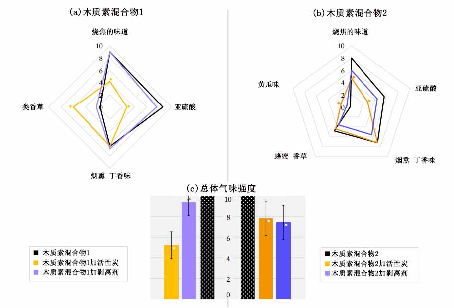 圖1:(a)木質素混合物1和(b)混合物2的氣味特征,(c)用活性炭或汽提劑處理的兩種木質素混合物的整體氣味的等級。