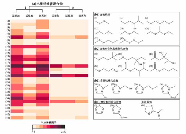 圖2:(a)在未處理和處理過的兩種木質素混合物中檢測到的含硫氣味劑氣味稀釋因子的彩色差異和(b1-b5)硫氣味劑的結構式根據其化學結構分為亞組數字(2-44)是指氣味的連續順序。