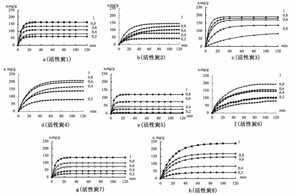 圖1:使用過的活性炭樣品在20℃時對來自VMA的正丁醇蒸氣的吸附動力學(xué)。