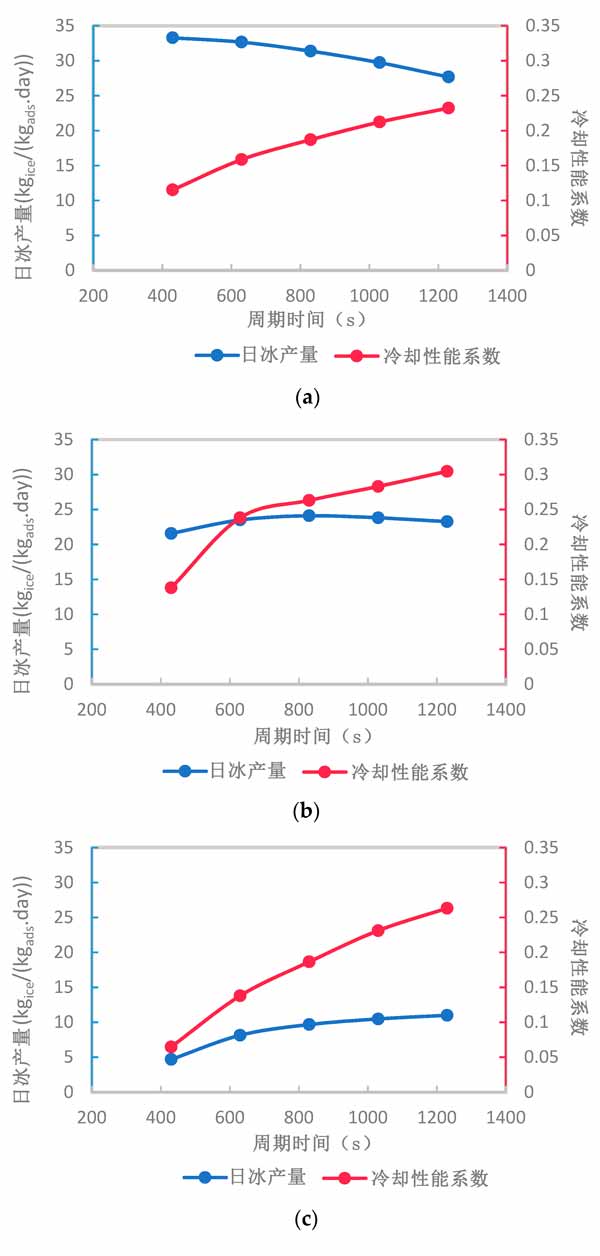 在活性炭厚度為2、5和10mm時,循環(huán)時間的變化對制冰系統(tǒng)的每日制冰量和冷卻性能系數(shù)的凈影響如圖4所示。總體而言,在給定范圍內增加循環(huán)時間可以增加或減少系統(tǒng)的每日制冰量,具體取決于活性炭復合材料的厚度。然而,無論活性炭復合材料的厚度如何,系統(tǒng)的冷卻性能系數(shù)通過增加循環(huán)時間而增加。盡管如此,系統(tǒng)冷卻性能系數(shù)在1230的較長循環(huán)時間和5mm活性炭復合材料厚度下達到其最大值。通過增加活性炭復合材料的厚度,日冰產(chǎn)量在不同循環(huán)時間內的變化范圍顯著減小,這可以通過比較圖4a-c中給出的每日制冰量范圍看出。這歸因于活性炭復合材料厚度較厚時有效吸收的減少。