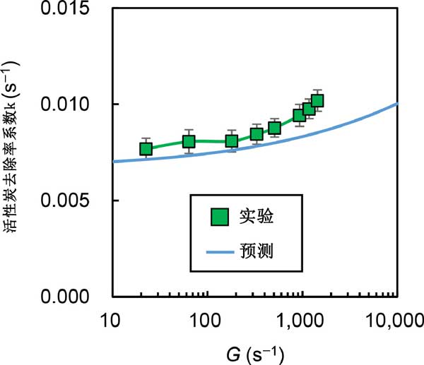 我們研究了混合強度對去除率系數(shù)(k)的影響(圖1)。我們繪制了實驗數(shù)據,實線顯示了方程式預測的值。實驗結果和預測結果都表明,去除率系數(shù)隨著混合強度的增加而增加,但在G>1000s-1的范圍內,實驗結果的增加率變得更陡峭,偏離預測的速率系數(shù)值。我們假設偏差背后的急劇增加是由于活性炭顆粒在高混合強度下的分解(在給炭時輕度聚集)。這些預測是在假設活性炭顆粒的尺寸(部分聚集在原料懸浮液中)在給炭后保持不變的情況下做出的,因為原位顆粒尺寸測量是不可能的。如果這個假設是正確的,那么去除率系數(shù)隨著混合強度的急劇增加,在高G對于在給炭時已經處于分散狀態(tài)的活性炭顆粒,不應觀察到-值范圍。為了驗證這一假設,我們使用了非聚集活性炭,其粒徑在分散處理前后沒有變化,我們在不同的混合強度。我們沒有觀察到隨著活性炭混合強度的增加,去除率系數(shù)的急劇增加,強烈表明觀察到的活性炭的急劇增加是由于高混合條件下的顆粒分解。