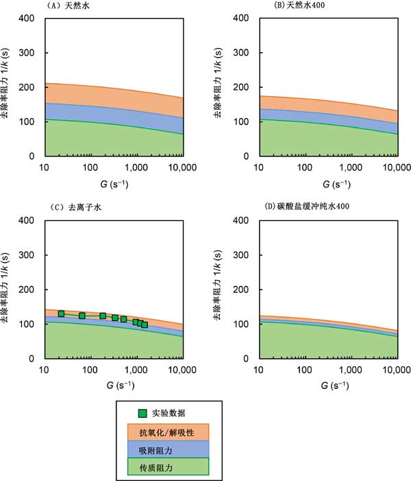 圖2:去除率阻力(1/k)分解成其成分(即,外膜傳質、吸附和氧化/解吸的速率阻力)與活性炭混合強度(G)的關系。