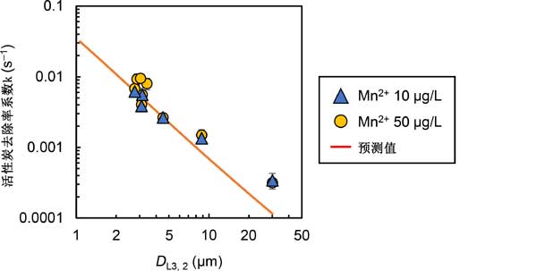 我們將Mn2+去除率系數(shù)(k)與活性炭的粒徑進行了比較(圖3)。我們使用源自相同活性炭的九種尺寸的碳顆粒繪制了實驗數(shù)據,以便與方程式的預測進行比較。實驗值和預測值幾乎一致,并且在雙對數(shù)圖上都顯示出線性關系。仔細觀察發(fā)現(xiàn),預測值的斜率比實驗值更陡,在較大顆粒范圍內,實驗值略大于預測值。這可能是由于顆粒形狀或表面性質的任何差異:我們假設了一系列參數(shù)值,包括球形值,這些預測與顆粒大小無關,但在實際的活性炭中,這些值可能隨顆粒大小而變化。總體而言,活性炭的粒徑對Mn2+去除性能有很大影響。