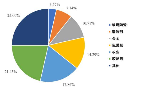 硼是自然界七大必需微量元素之一,少量的硼攝入有利于植物細胞膜保持其結構和功能的完整性,并維持正常的發育和物質運輸。硼不僅是生物體必需的微量元素,也是許多工業的重要原料,如制造業和農業。根據近期的統計數據,僅硼酸鹽就有300多種應用,全球四分之三以上的硼消耗量來自陶瓷、洗滌劑、化肥和玻璃(圖2)。在生產過程中,硼酸鹽是制造各種特殊玻璃和陶瓷的主要成分。在高級玻璃和玻璃纖維的生產中使用硼硅酸鹽可以提高玻璃的耐熱性和透明度,有利于提高其化學穩定性以及抗機械和熱沖擊的能力。在瓷釉中加入硼可以防止脫釉和開裂,提高產品的光澤度和耐久性。在瓷體中加入硼酸鹽有利于降低能耗,提高產品的機械強度。硼還用于生產微合金鍛鋼并提高鋼的沖擊強度。在農業領域,硼被用于生產含硼化肥等產品。但是灌溉水中的硼含量升高會直接導致動植物中毒造成危害,所以一定要控制排放。