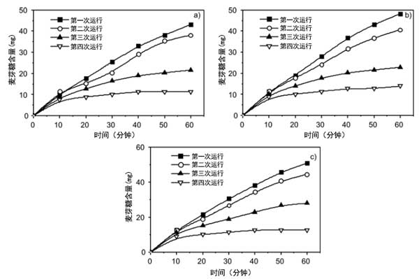 在間歇反應器中檢測游離酶和固定化酶的水解活性。通過將可溶性淀粉溶解在蒸餾水中制備%淀粉溶液,并通過0.1M/HCl將pH值調節至4.7。然后將1g含有α-淀粉酶的活性炭纖維置于測試小瓶中。隨后,加入100cm3的淀粉溶液,并將系統在40℃下不斷搖動的水浴中孵育。每10分鐘抽取1cm3溶液以確定水解麥芽糖的量。通過加入1cm3的3,5-二硝基水楊酸試劑終止反應。還在沸水浴中孵育5分鐘。還原糖(麥芽糖)的量通過分光光度法在540nm處測定。