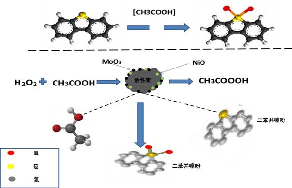 圖3:NiO-MoO3活性炭催化劑存在下H2O2/CH3COOH氧化體系對(duì)二苯并噻吩的氧化脫硫機(jī)理。