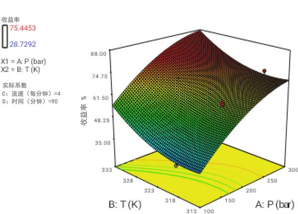 在本節(jié)中,使用三維圖檢查了不同操作參數(shù)對活性炭超臨界再生的影響,而其他變量保持在其各自固定的中間水平(壓力,200bar,溫度45℃,流速,4g/分鐘和時間90分鐘),對應(yīng)于零代碼。圖2顯示了壓力和溫度影響的3D圖。可以觀察到,再生產(chǎn)率隨著壓力和溫度分別從100bar增加到300bar和從40增加到60℃而增加。基于中心復(fù)合設(shè)計,壓力對再生產(chǎn)率的影響最重要。特別是,壓力的增加導(dǎo)致CO2的溶解能力增加,因此溶質(zhì)的溶解度也增加。另一方面,溫度的升高對再生產(chǎn)量有輕微的積極影響。在100~300bar的壓力下,隨著溫度的升高,溶質(zhì)的溶解度增加,這是由于溶質(zhì)蒸氣壓增加的作用。因此,溶質(zhì)的溶解度隨著溫度的升高而增加。另一方面,提取物蒸氣壓隨著溫度升高而升高,這導(dǎo)致超臨界流體擴散率增強。