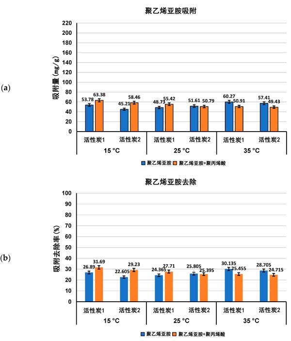 圖2:聚乙烯亞胺吸附量(a)及其從活性炭表面去除的百分比(b)在單一和混合吸附物系統中,在三個檢測溫度pH3下。