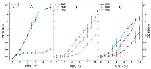 厭氧消化物中存在的大量和微量營養(yǎng)素的多樣性可能有利于藍藻代謝。即使活性炭預(yù)處理顯著降低了幾個參數(shù),包括COD、濁度和苯酚含量,原料(4405mg/L)和預(yù)處理消化物(4220mg/L)的銨濃度仍然高于藍藻螺旋藻支持的閾值濃度(100–150毫克/升)。在這種情況下,使用以三種不同稀釋率稀釋的原始和預(yù)處理消化物進行了一系列藍藻毒性測定:20×、40×和60×。未稀釋的消化物,無論是否用活性炭處理,都沒有在本實驗中進行測試,因為初步培養(yǎng)分析表明它們對培養(yǎng)物毒性太大(數(shù)據(jù)未顯示)。因此,該實驗的目的是比較以不同稀釋率稀釋的兩種消化物以及兩個對照組之間的生長性能。連續(xù)測量680nm處的OD超過10天,以評估所有條件下的生長情況。在三種不同稀釋因子下測試的原始消化物(RD)和處理過的消化物(TD)條件下,觀察到類似生長趨勢(圖2A、B)。當(dāng)增加原始和預(yù)處理消化物的培養(yǎng)基稀釋倍數(shù)時,會產(chǎn)生更高的生長反應(yīng)。同樣,滯后期受原始消化物和預(yù)處理消化物的稀釋因子的影響,觀察到的滯后期越長,消化物越濃縮。例如,稀釋20倍和40倍的未處理消化物的滯后期分別持續(xù)4天和2天。在本研究中,根據(jù)稀釋倍數(shù)和預(yù)處理條件,使用221和71mg/L之間的初始銨氮(NH4+-N)濃度,鈍頂藻能夠增殖。一般而言,原始消化物和預(yù)處理消化物的更高稀釋度產(chǎn)生更高的生長。
