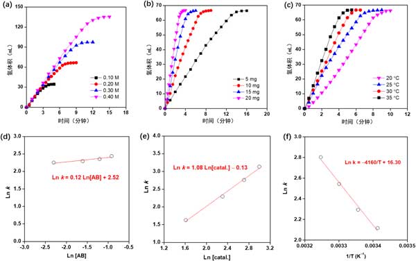 圖2:在不同的(a)氨硼烷濃度、(b)催化劑量和(c)反應溫度下,Co0.8Cu0.2P/活性炭催化氨硼烷水解產生的氫氣體積與反應時間的關系圖。(d和e)氫氣產生率(k)分別與氨硼烷濃度和催化劑濃度的對數圖。(f)lnk與1/T的Arrhenius圖 。