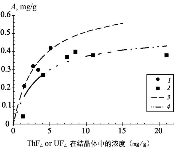 圖2:從熔體中吸附釷和鈾氟化物的等溫線。(1,2)實驗數據;(3,4)根據Langmuir方程逼近實驗點。(1,3)四氟化鈾;(2,4)THF4。