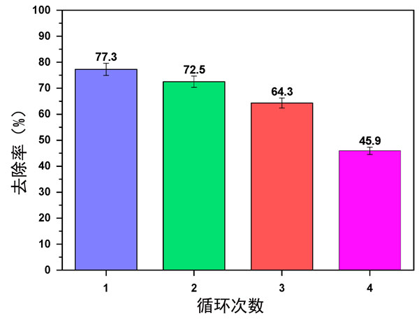 通過回收研究調查了改性活性炭的再利用以從廢水中去除活性黑5。進行實驗時,最初使用100mg/L活性黑5和0.8g/L的改性活性炭,pH值為2。在第一個循環之后,使用0.01M/NaOH溶液對所使用的改性活性炭顆粒進行處理大約2小時。此后,用蒸餾水沖洗顆粒以除去任何殘留的堿。選擇被認為可接受的重復時間,以便能夠在后續循環中重復使用吸附劑。研究結果如圖3所示。在用1M/NaOH處理成功再生后,解吸的改性活性炭能夠重復使用多達四個循環以去除活性黑5;钚院5的去除百分比在第一個循環中約為77.3%,在第四個循環后下降至約45.9%?偟膩碚f,這項研究證明了將改性活性炭吸附劑重復使用四個循環以從廢水中去除活性黑5的潛力。