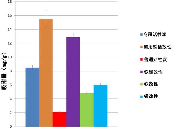 為了比較各種活性炭吸附砷(V)的效果,將0.1克活性炭添加到50mL/50ppm砷(V)樣品中。將樣品以150rpm攪拌6小時,然后過濾,然后對濾液進行元素分析。為了比較不同活性炭基質的功效,以每克活性炭吸附的砷(V)毫克數(mg/g)來比較相對于添加的活性炭量的吸附。如圖所示數字​圖1,與鐵、錳和鐵/錳一起官能化后,砷的吸附有顯著改善。