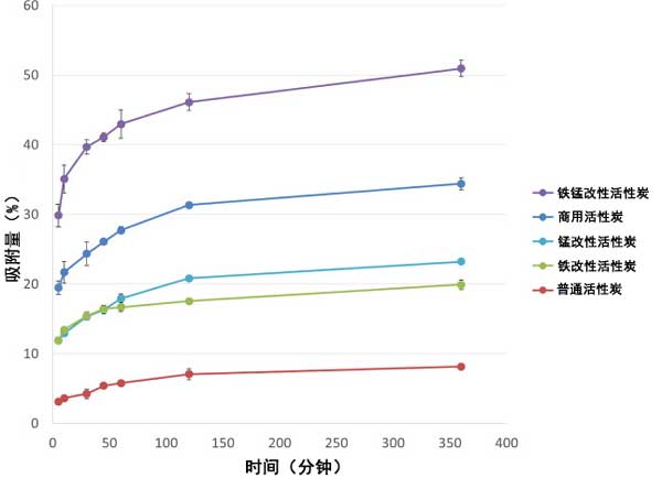 砷(V)動力學曲線使用負載金屬的活性炭、標準活性炭和商業活性炭對砷(V)的吸附動力學進行了評估,結果顯示在​圖5。對于每種碳材料,砷(V)的吸附在6小時后達到平衡。標準活性炭顯示出最低的吸附容量,6小時后達到總可能吸附量的8.13±0.16%。負載鐵的活性炭和負載錳的活性炭均表現出比標準活性炭更高的吸附容量,表明表面的金屬負載確實提高了活性炭的吸附容量。負載鐵和負載錳的活性炭在短攪拌時間和長攪拌時間下對砷的吸附均比標準活性炭有顯著改善,6小時后分別達到19.90±0.71和23.21±0.23%。
