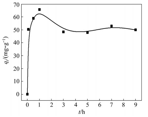 用100mL硫代硫酸銅溶液進行銅吸附動力學試驗,初始銅濃度為3g/L。硫代硫酸鹽與銅的摩爾比為8:1。除另有說明外,0.5g活性炭用于吸附試驗。圖2顯示了Cu(S2O3)23−在活性炭上的吸附動力學。活性炭對銅的吸附容量在前1h急劇增加,隨后略有下降并趨于穩定。