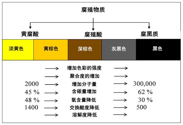 腐殖質(zhì)的性質(zhì)與其成分有非常密切的聯(lián)系,其成分受到腐殖化過程的影響,與分子(分子量)和顆粒的大小、分散程度(真溶液或膠體溶液)、極性(由這些決定)由骨架的性質(zhì)(芳香族;脂肪族)決定,主要是官能團的類型、數(shù)量和解離能力。腐殖質(zhì)成分的功能在于其在水中的溶解度(黃腐酸的溶解度比腐植酸高,因此天然水中平均含有87%的黃腐酸)、聚集能力、解離能力(主要是羧基)官能團)和相關的電荷比(粒子的zeta電位)。腐殖質(zhì)的一些特性也受到水的成分及其​​pH值的影響。圖1顯示了腐殖質(zhì)的基本特性。