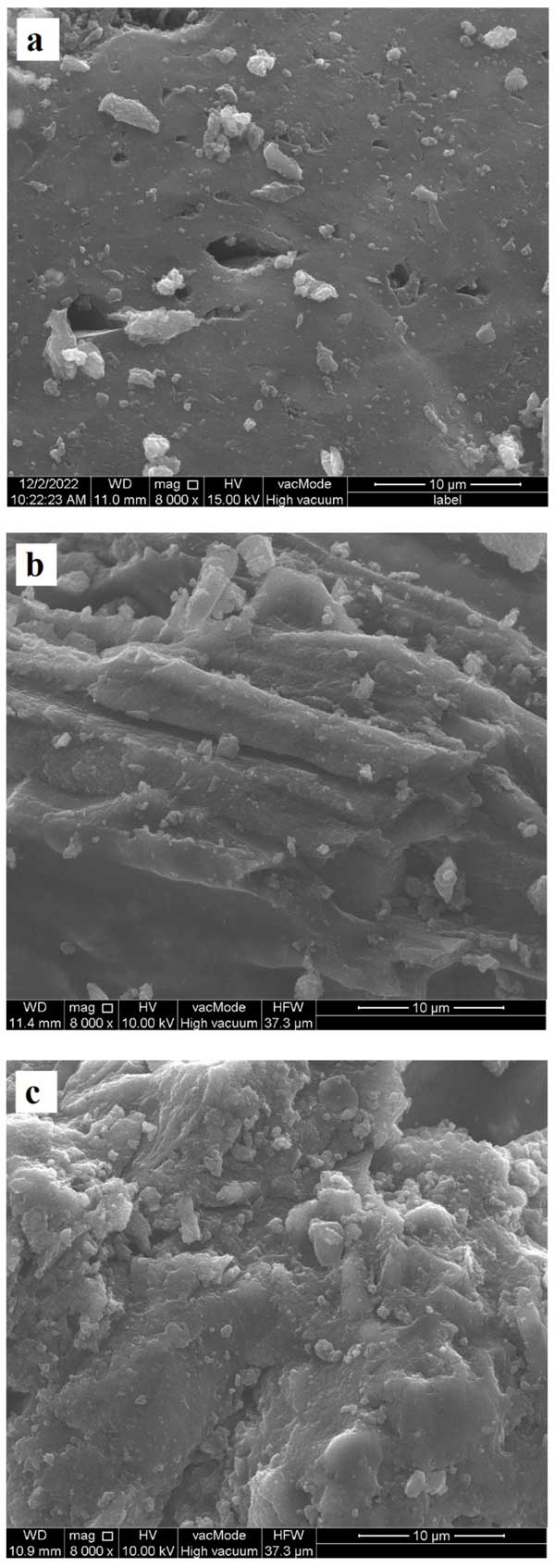 圖2:不含(a)以及含有PAA(b)和PEI(c)吸附物的活性炭2的SEM圖像。