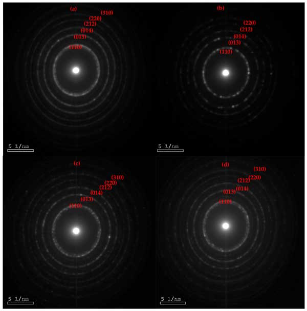 圖2:通過電子衍射HRTEM獲得的合成(a)BiOI、(b)1C/BiOI、(c)5C/BiOI和(d)10C/BiOI納米復合材料的SAED圖像。