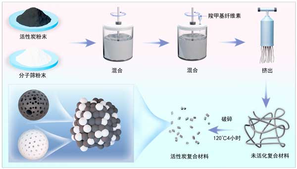 活性炭之所以特別適合用于吸附過程,是因為它具有高度多孔的無定形結構,能夠吸附各種分子。它具有微孔和中孔,可以容納各種大小的分子,補充了分子篩的孔隙特異性;钚蕴窟具有利用功能基團改變其表面化學性質的潛力,從而增強其與目標分子的相互作用。本文以羧甲基纖維素為黏合劑,通過機械混合和擠出法制備了一系列 華活性炭分子篩復合材料(圖1)。