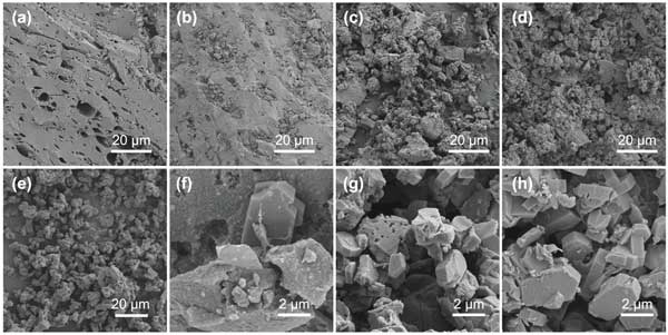 圖2:(a)活性炭、(e)分子篩、(b,f)活性炭復合材料-10%在不同放大倍數下的SEM圖像,(c,g)活性炭復合材料-20%在不同放大倍數下的SEM圖像,以及(d,h)活性炭復合材料-30%在不同放大倍數下的SEM圖像。