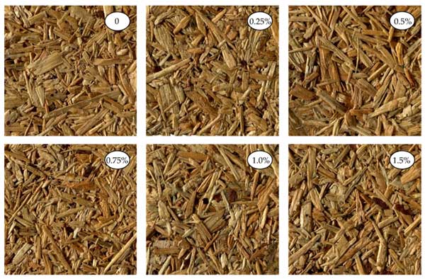 在UF樹脂中添加活性炭還可以改善刨花板的各種機械性能。研究表明,活性炭可以提高板材的尺寸穩定性、強度和防水性。這在擔心潮濕暴露的應用中尤其有益。所生產的刨花板的外觀如圖2所示。添加高達1.5%活性炭沒有觀察到任何影響。相反,在碳含量較高的情況下,所得板材變暗并變灰。因此,在不影響材料美觀的情況下,這可以被視為較小負載的優勢。