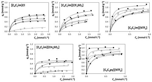 得到的結果表明,活性炭的不同的吸附能力與IL的性質和溶液中的鹽量有關。一般而言,對于咪唑鎓的ILs,陰離子對其對活性炭的吸附能力的影響按照以下順序:Cl - ≈[CH 3 SO] <[CF 3 SO 3 ] -<[NTf 2 ] 。這一趨勢的結果和預計的相符合,并且表明,隨著陰離子疏水性的增加,活性炭對ILs的吸附逐漸增加。另一方面,考慮到IL陽離子家族,活性炭能吸附更多的吡啶鎓比基于咪唑類的對應物。總之,這里證明,如果伴隨使用無機鹽來促進鹽析現象并增強隔離度,則活性炭也可以用作水介質中低濃度存在的親水性IL的有效吸附劑。得到的結果表明, 在鹽的存在下,親水性ILs的例如[C 4 C 1 im] Cl和[C 4 C 1 im] [CH 3 SO3 ]的K d值增加高達5.5倍。這種新方法可以被設想為減少由使用IL的工業過程產生的含水物流污染的有希望的途徑。