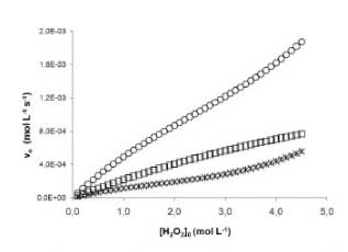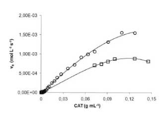 在圖3中關系決定于過氧化氫的初始濃度的反應初速度的變化,當活性炭(CAT)的質量-體積是比:(1)1.0×10 -3克毫升- 1,(b)2.0×10 -3 g mL -1和(c)4.0×10 -3 g mL -1,溫度為298 K.