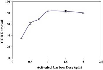 吸附劑劑量在廢水后處理吸附過程中起著重要的作用。活性炭劑量從0.25到 2g / L的變化進行了幾個實驗。圖2顯示了對活性炭劑量的吸附容量(q)。 隨著吸附劑用量增加到0.75g / L,COD的殘留量從470mg / L 降至51mg / L,超過了COD的輕微下降。通過將吸附劑(GAC)的劑量增加到 2g / L,類似物COD去除百分比從34.8%增加到81%。因此, 從經濟角度來看,最佳的活性炭劑量是0.75g / L。