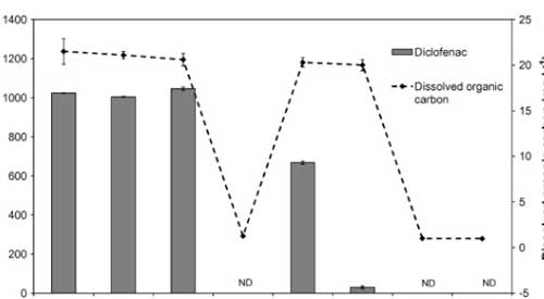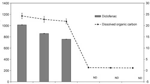 使用活性炭除去雙氯芬酸鈉是定性高效的,通過零吸收和低濃度的DOC的,并且在通過所獲得的色譜中沒有檢測到雙氯芬酸鈉。得在所研究的處理階段中,在活性炭上的吸附導致最顯著的雙氯芬酸鈉去除。因此,雙氯芬酸鈉沒有水樣中的這個階段(LOD之后檢測 = 2 μg L−1)。考慮到所述方法的定量限為3 μg L−1,通過活性炭除去雙氯芬酸鈉的至少99.7%。因為沒有研究活性炭的破裂曲線,所以活性炭的結果可以被認為是定性的。然而,為了研究在大型水處理廠中去除雙氯芬酸鈉,必須改​​進該方法以達到較低的檢測限(約μg L−1)。