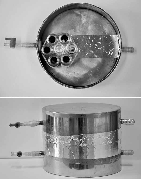 將0.15g活性炭或生物炭稱入20ml透明頂空小瓶中。將三次重復(每次總共6個小瓶)放入容器中。容器由兩個不銹鋼圓柱形盒子構(gòu)成,每個15厘米內(nèi)徑和4厘米高(圖1)。將5mL純氯化苦液體注入20ml透明頂空小瓶中并放入容器中以產(chǎn)生飽和蒸氣相。將小瓶放入容器后,用鋁帶密封容器。然后將容器置于溫度穩(wěn)定在30℃的培養(yǎng)箱中。孵育3,6,9,12和24小時后,從培養(yǎng)箱中取出容器。打開容器并在通風櫥中通風約30分鐘。然后使用與已經(jīng)描述的相同的方法分析活性炭炭或生物炭。