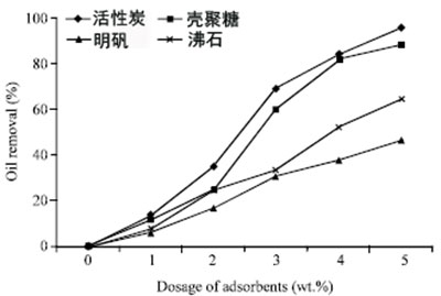 通過(guò)改變吸附劑的重量,以100rpm的混合速率,1小時(shí),分析不同吸附劑用量(wt。%)對(duì)活性炭與沸石相比對(duì)MEA去除殘留油的影響。混合時(shí)間,在25-30℃的溫度下接觸時(shí)間為1小時(shí)。測(cè)試在樣品的原始pH下進(jìn)行,即11.21。在CO 2去除單元系統(tǒng)中根據(jù)需要維持pH水平。圖1顯示了使用活性炭和沸石從MEA廢水中去除殘留油的百分比。從圖1中可以看出觀察到,在最高吸附劑用量(5重量%)下,活性炭與其他物質(zhì)相比顯示出最高的殘油去除率。活性炭成功除去87%的殘油,沸石為46%。可以得出結(jié)論,活性炭最好比其他吸附劑更好地除去殘油。