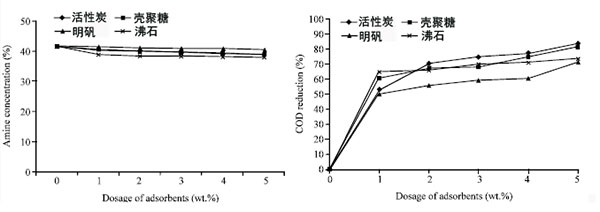 該單乙醇胺廢水含有許多類(lèi)型的分子和離子。因此,某些分子和離子基于其特性被吸附到這些吸附劑表面上。活性炭具有疏水表面,有利于空氣中的有機(jī)物。同時(shí)沸石是親水性吸附劑。吸附劑的這些特性有助于降低COD水平。從結(jié)果可以看出,與活性炭和沸石相比,活性炭是降低COD水平的效果好的吸附劑。