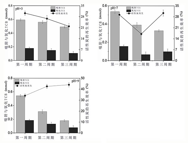 在活性炭的再生過程中,首先進行吸附過程,同時將溶液pH固定在7,選擇反應時間12小時(根據達到吸附平衡時的動力學試驗結果)。吸附過程進行3次以幫助活性炭飽和(未完全飽和),然后將飽和的活性炭冷凍干燥以幫助再生。基于吸附的TCE量,將溶液的pH分別調節至3,7和9。吸附/再生循環重復3次。在反應過程中分析TCE,HO和氯化物濃度。