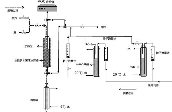 在稱重后將活性炭重新安裝到反應(yīng)器中。然后將閥門(mén)切換到解吸過(guò)程。將冷卻器的溫度設(shè)定為5℃,并加熱加熱帶直至達(dá)到解吸介質(zhì)的所需溫度(100℃或130℃)。解吸時(shí)間為10分鐘。當(dāng)反應(yīng)器的中心達(dá)到約35℃時(shí),將解吸介質(zhì)引入反應(yīng)器中。然后收集解吸的溶劑。當(dāng)滿足設(shè)定的解吸時(shí)間時(shí),終止加熱和解吸介質(zhì)并且溫度開(kāi)始下降。此后,將吹掃的壓縮空氣注入(在某些實(shí)驗(yàn)測(cè)試中使用氮?dú)?到反應(yīng)器中,直到中心溫度降至室溫。收集解吸的溶劑并稱重用于計(jì)算活性炭的工作容量。工作容量定義為吹掃后飽和VOC吸附容量與碳上殘余VOC的差值。然后使用氣相色譜儀分析溶劑的組成。