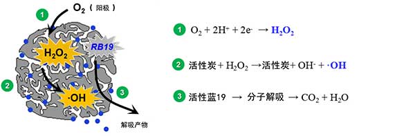 該方法的關鍵特征之一是沒有氧化劑或催化劑外部添加到系統(tǒng)中。過氧化氫電生成和OH生成都發(fā)生在負極化的活性炭上。因此,RB19分子,過氧化氫分子和OH自由基處于相同位置(活性炭的孔隙和表面),這有利于短壽命OH的RB19裂解。擴大此流程的關鍵是活性炭與當前不銹鋼網保持良好可靠的聯(lián)系。這種方法可以將吸附于活性炭內的分子去除,再生活性炭的吸附能力,是一種比較好的活性炭再生方法。